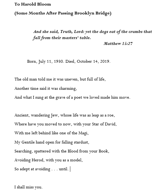 Written by Apoc18:4March 29, 2020March 29, 2020 To Harold Bloom Share this: Share on X (Opens in new window) X Share on Facebook (Opens in new window) Facebook Like Loading... Related Leave a comment Cancel reply Δ