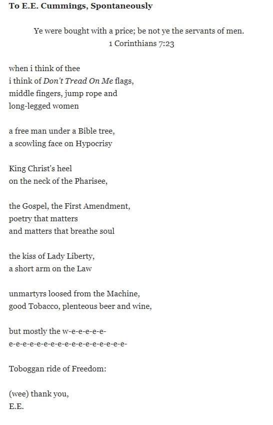 Written by Apoc18:4December 26, 2020 To E. E. Cummings, Spontaneously Share this: Share on X (Opens in new window) X Share on Facebook (Opens in new window) Facebook Like Loading... Related Leave a comment Cancel reply Δ