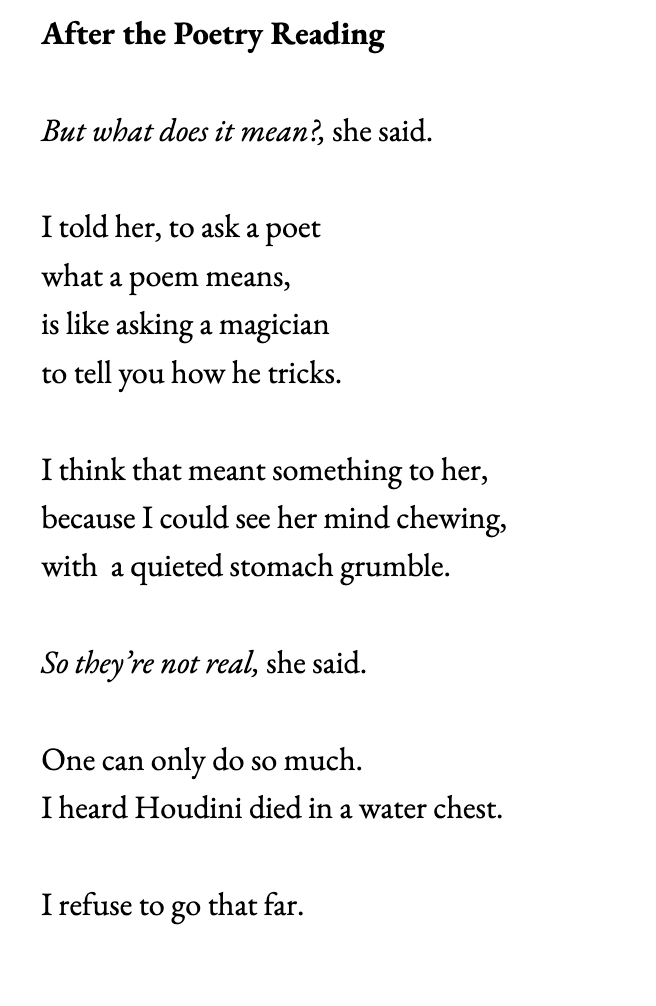 Written by Apoc18:4January 20, 2026 After the Poetry Reading Share this: Email a link to a friend (Opens in new window) Email Share on X (Opens in new window) X Share on Facebook (Opens in new window) Facebook Like Loading... Related Leave a comment Cancel reply Δ